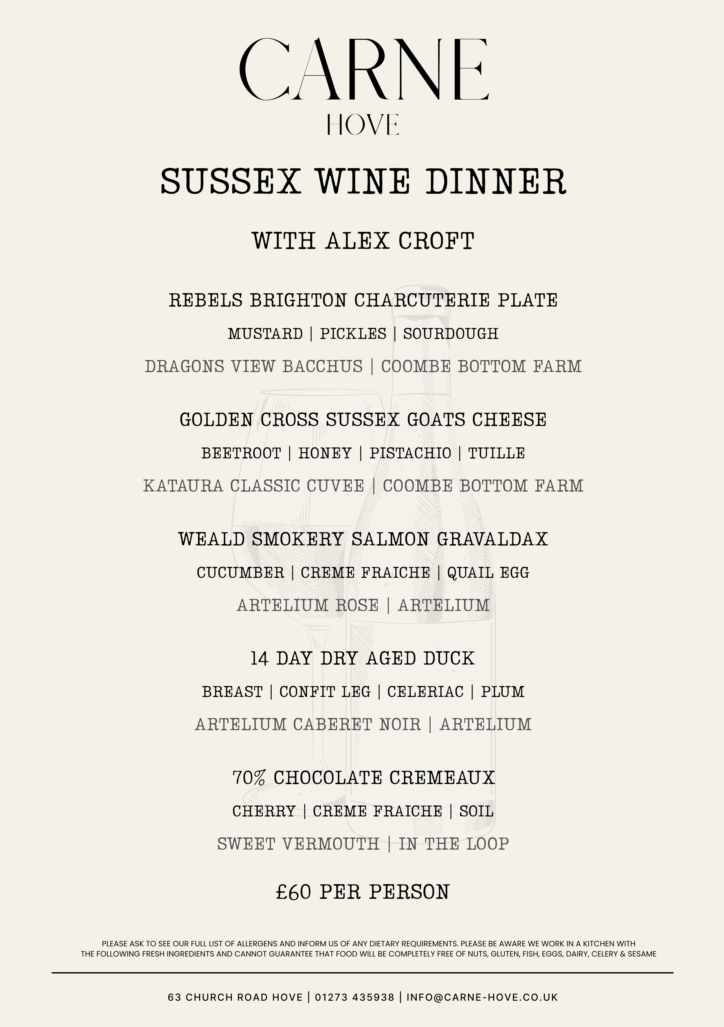 A one-night celebration of Sussex producers and winemakers. Join us at Carne for a seasonal multi-course menu paired with wines from Coombe Bottom Farm and Artelium. From local charcuterie and Golden Cross goats cheese to dry aged duck and chocolate cremeaux, each course showcases the craft and character of our region.